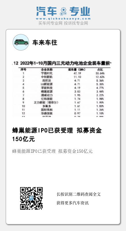 11月18日,上海证券交易所披露,蜂巢能源科技股份有限公司(下文简称“蜂巢能源”)科创板IPO已获得受理。自此,这家全球前十动力电池企业中唯一未上市的公司正式进军资本市场。