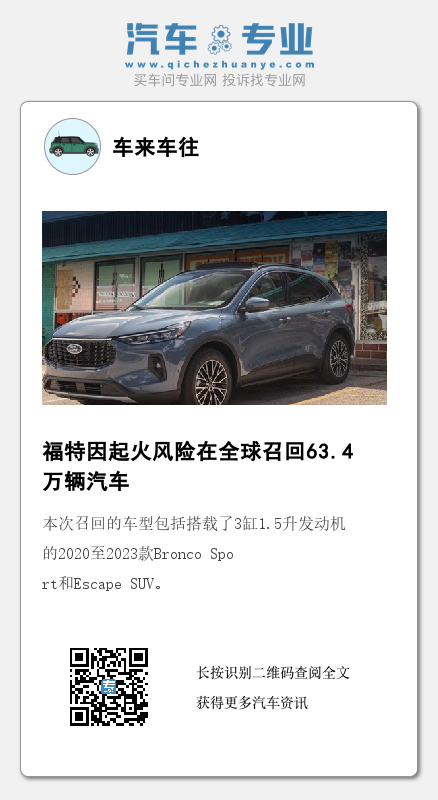 福特表示,本次召回的车型包括搭载了3缸1.5升发动机的2020至2023款Bronco Sport和Escape SUV,其中许多车辆已经在今年4月进行过召回,原因是机油分离器外壳可能破裂并出现泄漏,可能导致发动机起火。美国高速公路交通安全管理局(NHTSA)表示,先前的召回计划修复的车辆仍需要接受新的召回修复。