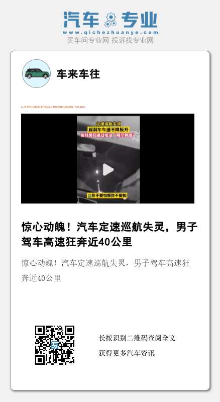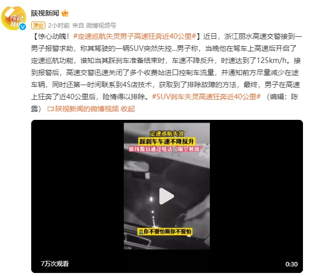 近日,浙江丽水高速交警接到一男子报警求助,称其驾驶的一辆SUV突然失控...男子称,当晚他在驾车上高速后开启了定速巡航功能,谁知当其踩刹车准备结束时,车速不降反升,时速达到了125km/h。接到报警后,高速交警迅速关闭了多个收费站进口控制车流量,并通知前方尽量减少在途车辆,同时还第一时间联系到4S店技术,获取到了排除故障的方法,最终,男子在高速上狂奔了近40公里后,险情得以排除。