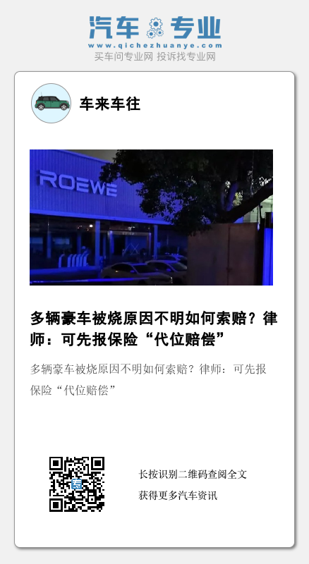 浙江融哲律师事务所王雯律师认为,在本案中,由于目前起火原因还未查明,需要等消防机关对事故的起火原因和灾害成因进行认定,由事故责任方承担赔偿责任。如果是因为车行的过错导致火灾,车行需要对此承担责任。如果车主自身车辆是起火原因,车辆自燃造成的损失由车主承担。如果通过鉴定,证明车辆确实存在质量问题,可找机动车生产企业或经销商索赔。在目前责任方不明的情况下,受损车辆车主可向保险公司索赔,并采用“代位赔偿”的方式,再由保险公司代投保人向事故责任方追偿。