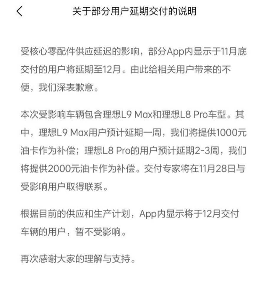 “受核心零配件供应延迟的影响,部分理想汽车App内显示于11月底交付的用户将延期至12月。据悉,本次受影响车型包含理想L9Max和理想L8Pro,其中理想L9Max预计延期1周、理想L8Pro预计延期2-3周”。