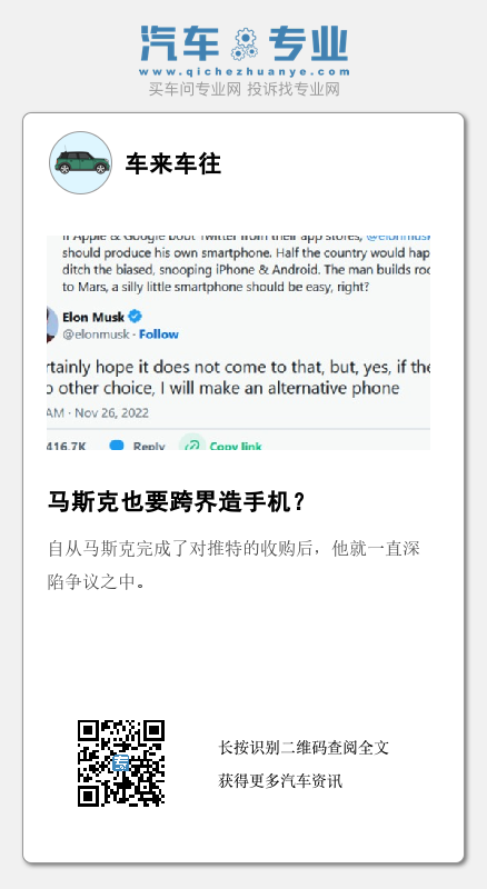 马斯克对Wheeler的帖子做出了积极回应,虽然他希望推特不会被苹果和安卓应用商店删除,但如果有需要,他会生产一款手机。马斯克写道,“我当然不希望事情发展到那种地步,但如果没有其他选择,我会生产一款手机。”