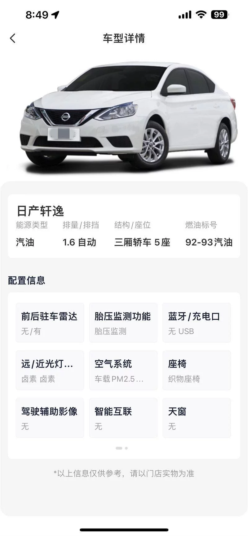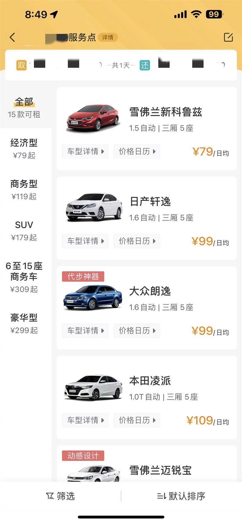 尽管我们特地隐去了这家租车公司的名字,但眼力好的你应该多少都能猜出来是哪家了。这是这家租车公司的选车页面,单日租赁价格在100以内的有3台车,我本来想选最便宜的那台科鲁兹的,但电联网点得知,这车故障了在维修,而最下面那台朗逸为了支援疫情防控被抽调走了,不在这个网点,换句话说,能选的只有中间这台白色的轩逸。