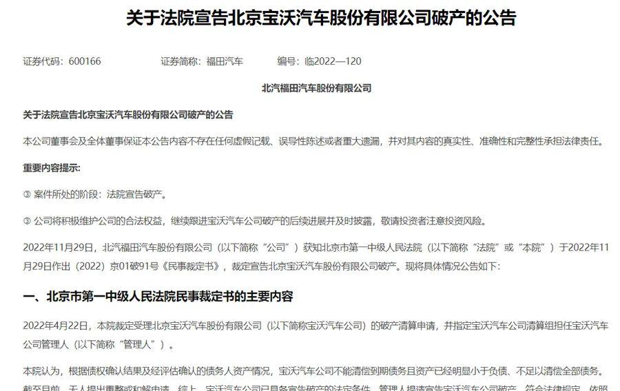 【文/道哥说车 听风吟】11月29日晚,福田汽车发布公告称,2022年11月29日,公司获知北京市第一中级人民法院于2022年11月29日作出(2022)京01破91号《民事裁定书》,裁定宣告北京宝沃汽车股份有限公司(下称宝沃)破产。