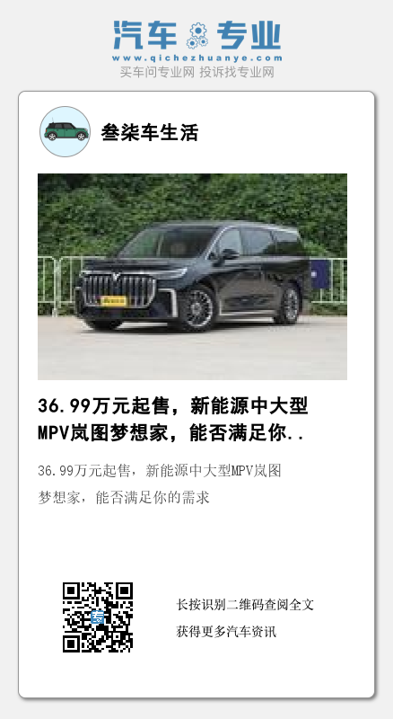 岚图梦想家全系车型,售价区间为36.99万元~68.99万元,共有多达12款车型可供选择,其中有三款定制版本的四座车型,售价都在60万元以上,这几款车注定是少数人的选择,那么在40万元左右,你会选择这款岚图梦想家吗?欢迎留言讨论。