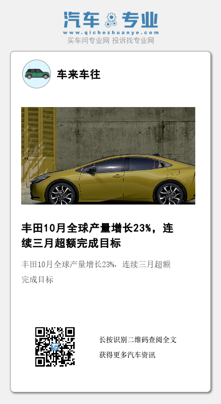 丰田当天还公布了10月份的销量情况。丰田10月份全球汽车销量为832,373辆,较去年同期增长22.8%。其中,丰田在日本销售了113,723辆汽车,同比增长34.3%;在海外销售了718,650辆汽车,同比增长21.2%。今年1月至10月,丰田在全球的累计销量同比微降0.7%至7,931,178辆。其中,丰田在日本的累计销量同比下跌13.4%,但在海外的销量同比微增1.6%。