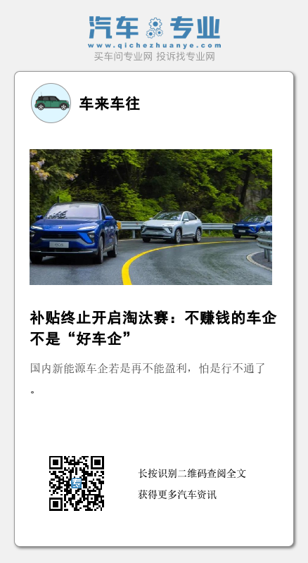 补贴停止,研发投入不断加大,再加上连年亏损。国内新能源车企今后的路并不好走,具备盈利能力的企业将更具备下一阶段的市场竞争力。
