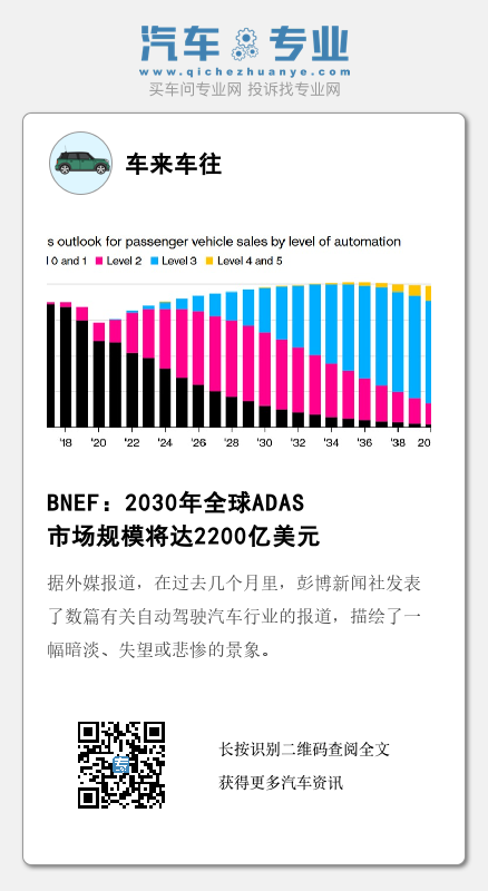 L2级自动驾驶和L3级自动驾驶都属于ADAS。在BNEF的展望中,到2025年,L2级自动驾驶汽车将占全球自动驾驶乘用车销量的50%以上,并在2028年达到峰值(约为5,300万辆)。
