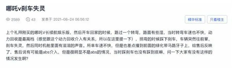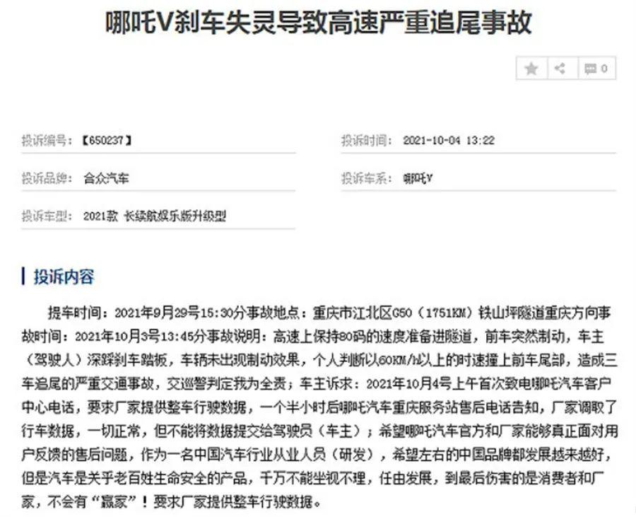 值得一提的是,哪吒V此前就曾遭遇多名车主投诉其存在刹车失灵问题,这其中就有较为严重的交通事故。