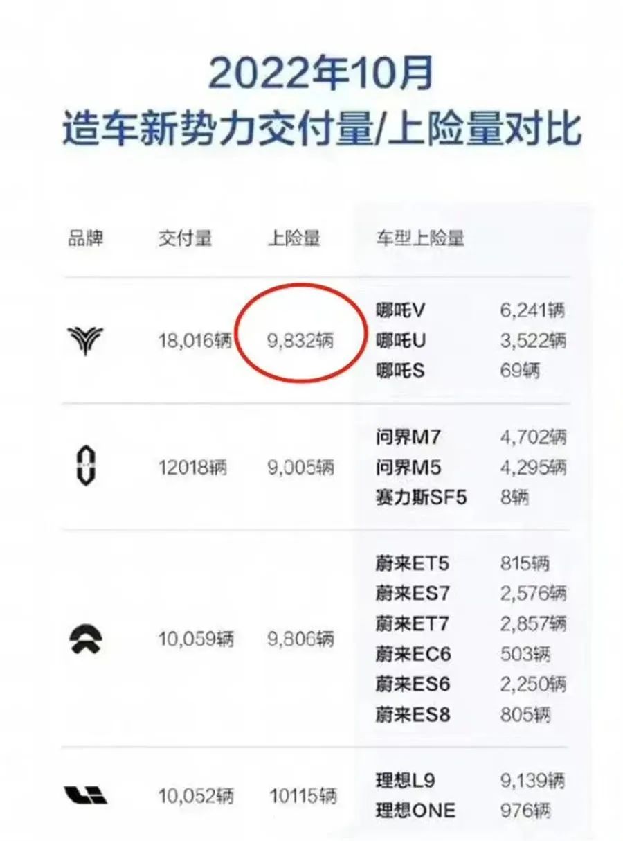 《道哥说车》编辑注意到,哪吒汽车今年10月交付量为18016辆,而上险量却只有9832辆,两项指标的数据相差了8184辆,相较之下,蔚来、问界的差值约三千辆,极氪、小鹏则只有三五百辆,可见,与其他竞争对手相比,哪吒两项指标的数据差距确实有些大。交付量与上险量如此大的差距是什么原因?哪吒汽车是否存在交付量数据注水的嫌疑呢?