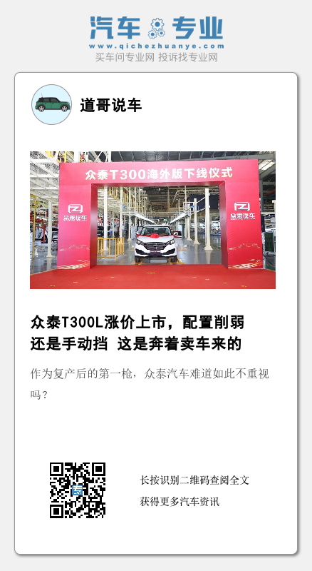 2023款众泰T300L虽仅有一款车型,但售价已经超过了2019款众泰T300顶配车型的售价,与此同时在配置上也有所削弱,甚至还是手动版本。作为复产后的第一枪,众泰汽车难道如此不重视吗?还是说,只是为了告诉我们,它复产了。