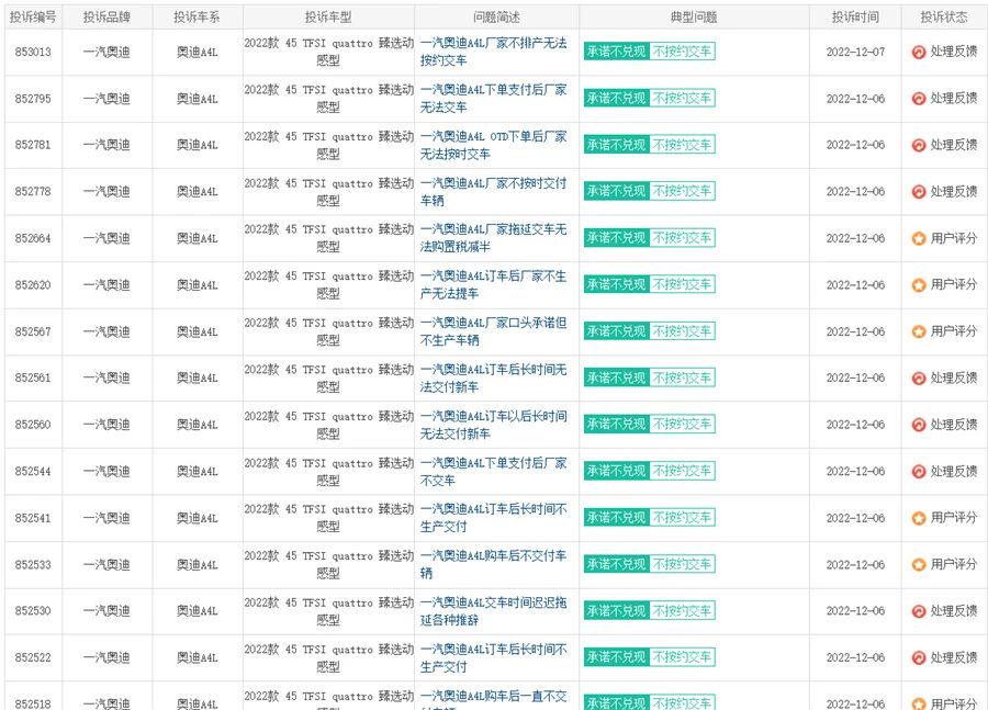 从车质网的投诉反馈来看,从12月开始至今短短8天,有关奥迪A4L无法按时交付的投诉已经多达31次,如此大规模的投诉正在反映消费者们焦急等待的心情。订车多个月仍然不交付的案例比比皆是。另据消费者投诉称,无法交付的原因包括奥迪工厂停产、减产、材料零部件紧张、没有排产计划等。