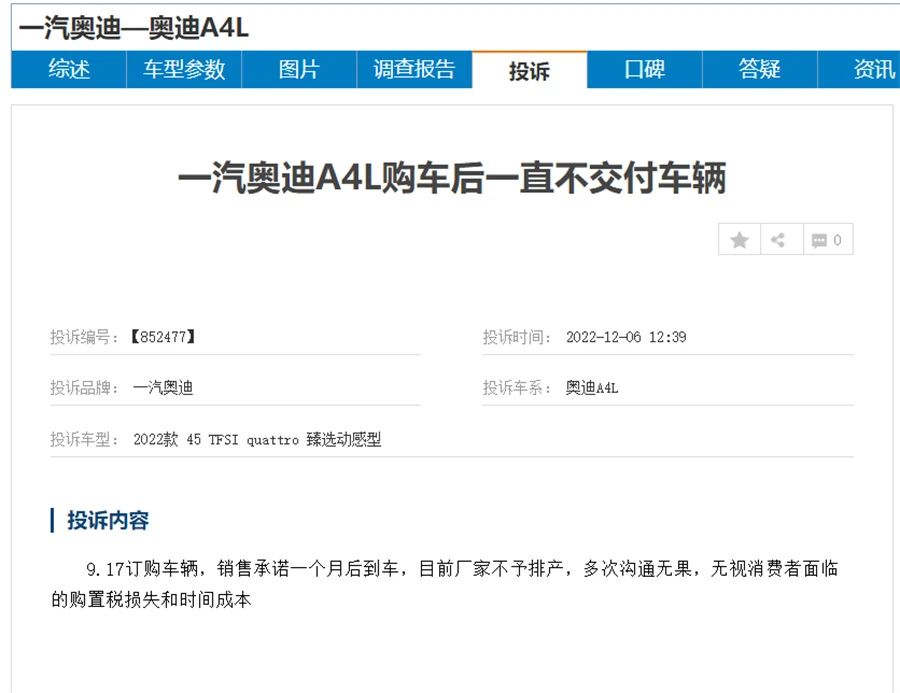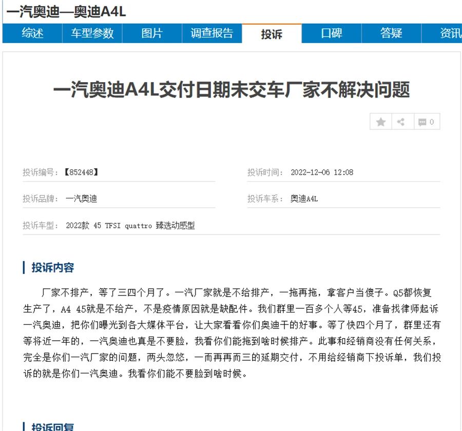 “一汽奥迪A4L购车后一直不交付车辆,订车3个月一直不生产”……