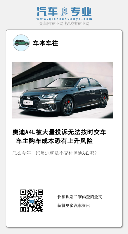 《汽车专业网》编辑注意到,近日不少奥迪A4L订车车主在第三方汽车投诉平台车质网中投诉车辆无法按时交付的问题。从投诉内容来看,无法按时交付的车辆包括2022款奥迪A4L 45 TFSI quattro臻选动感型,以及2022款奥迪A4L 40 TFSI部分配置车型。