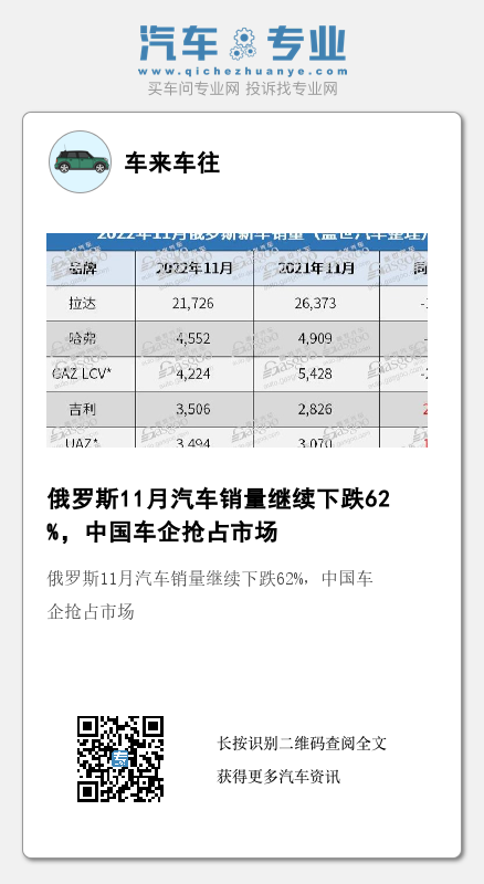 今年1至11月,俄罗斯汽车累计销量同比下降60.9%,不到55万辆,相比之下,去年同期的数据为140万辆。