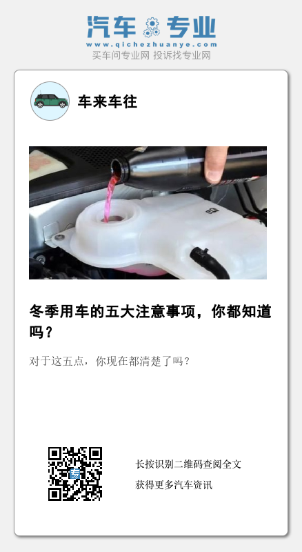 对于车辆的防冻液,很多车主都不太关注,毕竟,在保养项目中,防冻液一般都是4年或行驶6万公里才会更换。对于使用年限较长的车辆,一定要记得在冬天来临之际检查一下防冻液,如果过少就得添加,切记不要添加纯净水,一旦结冰,严重时甚至会导致发动机大修。