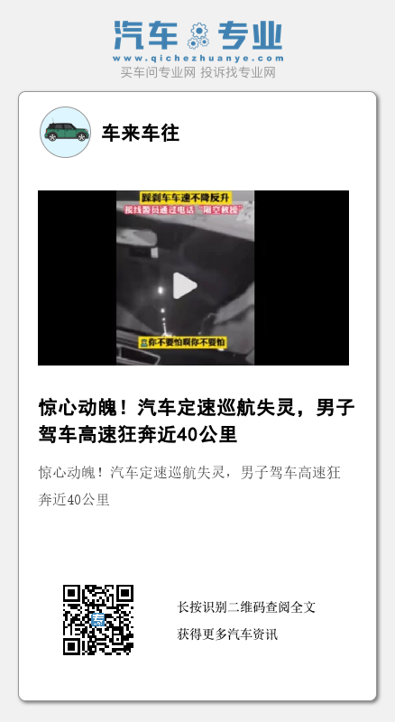 近日,浙江丽水高速交警接到一男子报警求助,称其驾驶的一辆SUV突然失控...男子称,当晚他在驾车上高速后开启了定速巡航功能,谁知当其踩刹车准备结束时,车速不降反升,时速达到了125km/h。接到报警后,高速交警迅速关闭了多个收费站进口控制车流量,并通知前方尽量减少在途车辆,同时还第一时间联系到4S店技术,获取到了排除故障的方法,最终,男子在高速上狂奔了近40公里后,险情得以排除。