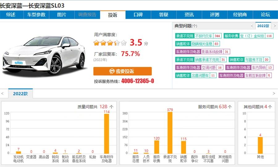 值得一提的是,虽然销量没有大爆,但是上市没多久的长安深蓝在投诉平台上的投诉倒是爆了。根据车质网上的投诉情况来看,长安深蓝SL03在产品质量和销售服务方面遭遇大量投诉。产品质量上的投诉表现为影音系统故障、空调问题、车内异响等,销售服务方面的典型问题则是不按约定交车、隐瞒相关信息、定金纠纷、虚假宣传等。如此集中且大面积的投诉在全新车型中是很少见的。