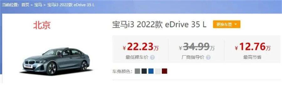 编辑注意到,宝马i3似乎还能下探到25万元以下,在大部分经销商普遍降了六七万的情况下,有一家北京地区的报价最离谱,居然直降12.76万元,裸车价只要22.23万元。