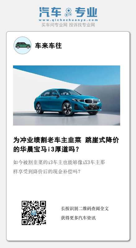 如今被割韭菜的i3车主也能够像iX3车主那样享受到降价后的现金补偿吗?《汽车专业网》编辑将继续关注。