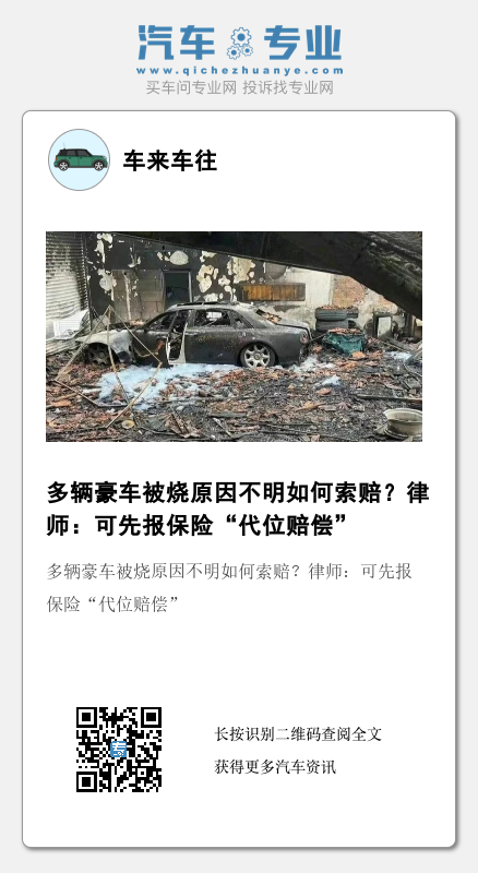 浙江融哲律师事务所王雯律师认为,在本案中,由于目前起火原因还未查明,需要等消防机关对事故的起火原因和灾害成因进行认定,由事故责任方承担赔偿责任。如果是因为车行的过错导致火灾,车行需要对此承担责任。如果车主自身车辆是起火原因,车辆自燃造成的损失由车主承担。如果通过鉴定,证明车辆确实存在质量问题,可找机动车生产企业或经销商索赔。在目前责任方不明的情况下,受损车辆车主可向保险公司索赔,并采用“代位赔偿”的方式,再由保险公司代投保人向事故责任方追偿。
