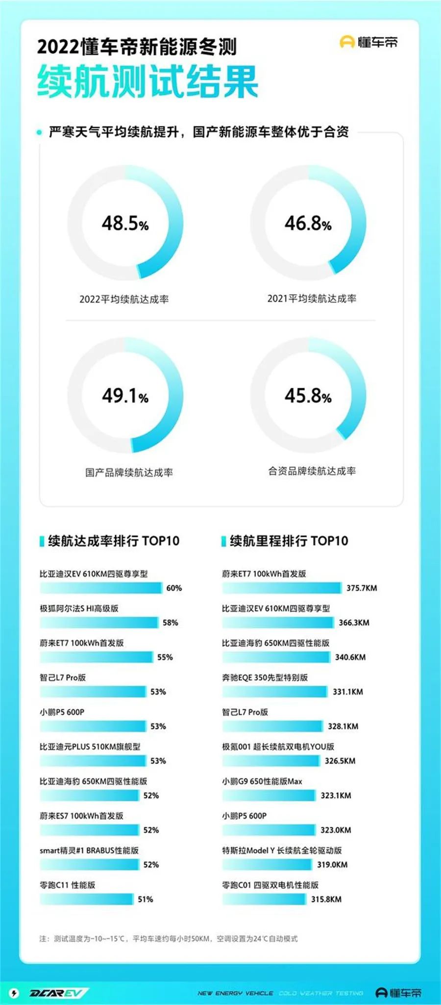 根据懂车帝的冬测,参与测试所有新能源车平均续航达成率48.5%,平均续航里程268公里,尽管相比2021年有一定提升,但这一数据还是让人大跌眼镜。毕竟,即便是前三名,它们的数据都好不到哪去。