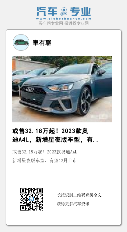 近日,我们从相关渠道获取了一组,2023款奥迪A4L(图片|配置|询价)的到店实车图,新车已经开始预订,预计将以32.18万元起售,推出六款车型可供消费者选择,还将新增一款星夜版车型。据可靠消息称,新车有望在12月中下旬上市。