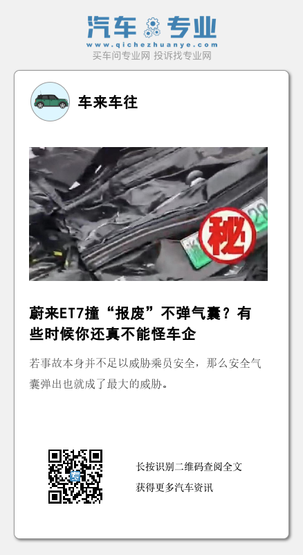 不过,仅以蔚来ET7此次事故来看,安全气囊未弹出或许是正确的。某知名高校汽车相关教授对《汽车专业网》编辑表示,这个碰撞气囊不点火是对的,没有吐槽点,前面撞的不厉害,追尾碰撞无须气囊保护,侧面没碰撞。气囊没道理点火。