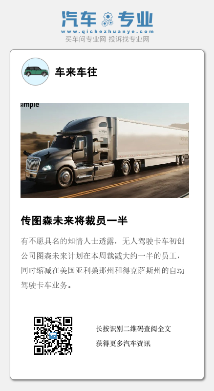 此外,图森未来还计划大幅缩减自动驾驶系统的搭建,而其在亚利桑那州和得克萨斯州的自动驾驶卡车的公共道路测试也将受到影响。《华尔街日报》称,图森未来在亚利桑那州图森市的大部分业务将被暂停,而该公司负责自动驾驶软件算法的团队将被大幅裁员。