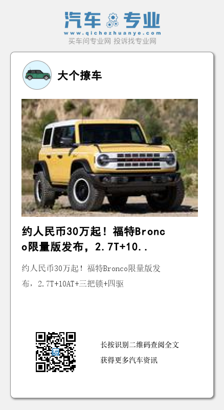 近日,笔者从相关渠道了解到,福特Bronco(图片)限量版已经正式发布,新车整体有着比较复古硬朗的风格,售价折合人民币约为31万起,并且还进行限量发售。