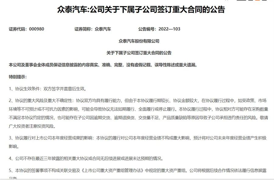 众泰汽车方面也提到,由于本协议履行期较长、协议金额较大,在协议履行过程中,如受政策、市场环境等不可预计因素的影响,可能会导致协议无法如期履行、全面履行或停止履行。此外,协议对方可能存在采购数量不满足本协议约定的情况等。尽管是常规性的风险提示,不过这也的确算得上是“按事实说话”。