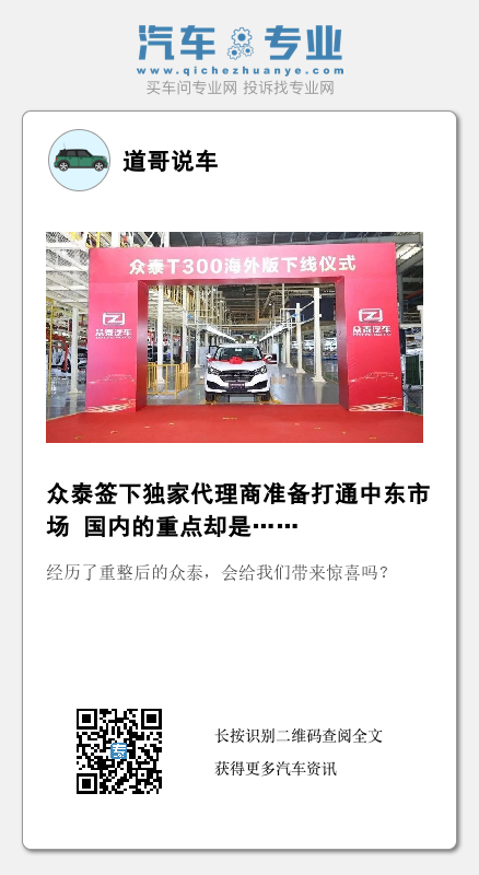 据了解,众泰T300海外版是众泰汽车官宣复工复产后的首款车型,而众泰此举也算是为海外版的车型出口做了铺垫。不过,众泰T300L也已经在国内上市,但似乎并未大规模宣传以及铺设相关渠道,《道哥说车》编辑询问了部分众泰汽车曾经的经销商得知,众泰方面也并未联系他们继续为众泰卖车。