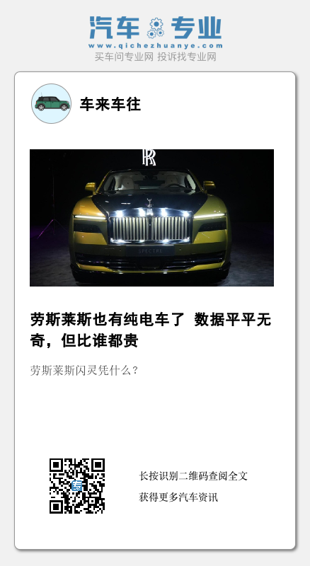甚至,劳斯莱斯闪灵,还是辆“油改电”,最贵的“油改电”。如果仅仅以这些产品点以及价格来看,如果再有某些造车新势力发布新车时候讲一句:媲美劳斯莱斯,超越劳斯莱斯,恐怕就真的有人信了。