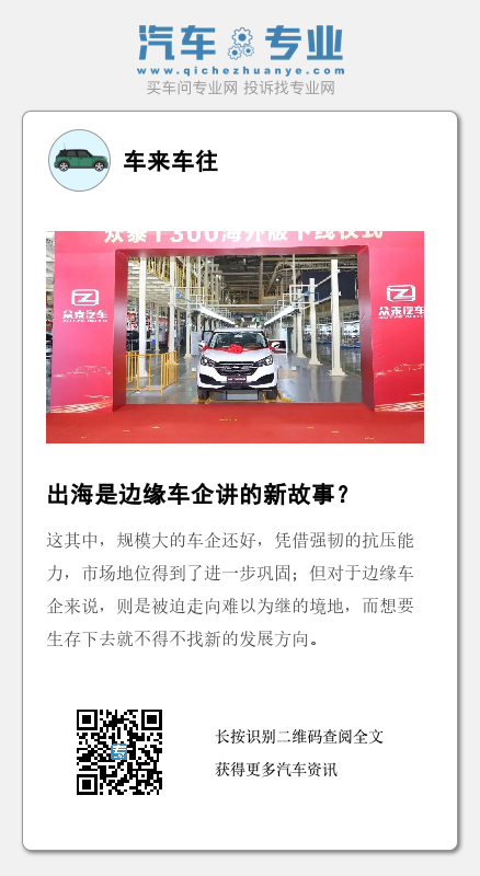 实际上,中国汽车品牌出海已经成为趋势,尤其是今年,国内汽车出口已达到了历史高点,数据显示,1-11月国内乘用车出口达到225.1万辆,同比增长57.8%。从这一角度看,边缘车企出海实则也是在顺应趋势。不过,对于国内基盘比较稳固的车企来说,出海是全球化的业务拓展,锦上添花,但对边缘车企来说,出海却犹如救命稻草,需要好好抓住。