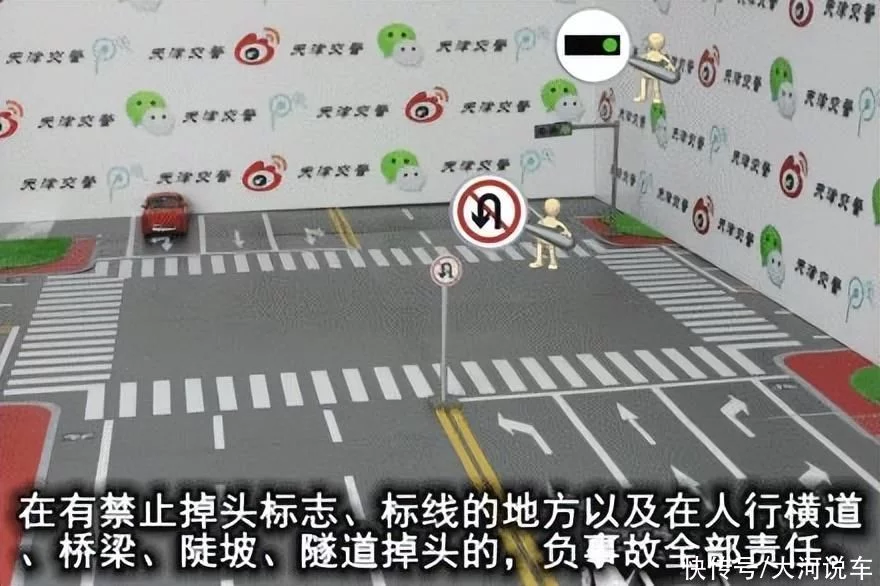 图中白车违反禁止掉头标志撞上了直行的红车,所以白车负全责。