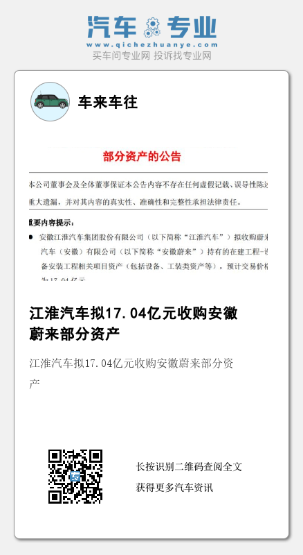 12月22日,江淮汽车发布公告称,该公司拟收购蔚来汽车(安徽)有限公司(以下简称为:安徽蔚来)持有的在建工程-设备安装工程相关项目资产(包括设备、工装类资产等),预计交易价格17.04亿元。