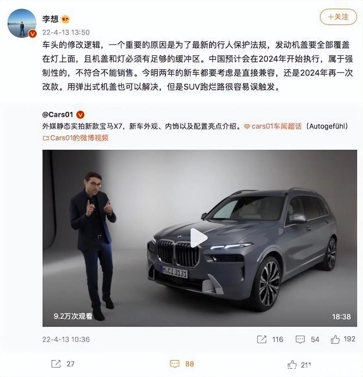 然而。忠实的宝马车主(曾长期驾驶X7和X5M)·造车新势力CEO中微博第一顶流·酷爱点评友商的理想汽车创始人李想老师,对此表示: