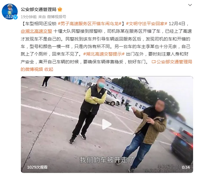 12月4日,湖北高速交警十堰大队民警接到报警称,司机陈某在服务区开错了车,已经上了高速才发现车不是自己的。民警找到该车并引导车辆返回服务区后,发现司机的车和开错的车,型号和颜色一模一样,只是内饰有所不同。另一台车的车主李某也十分无奈,自己就上了个厕所,回来车不见了。湖北高速交警提示:出门在外,要时刻注意人身和财产安全,离开自己车辆的时候,要确保车辆停靠稳妥,锁好车门。