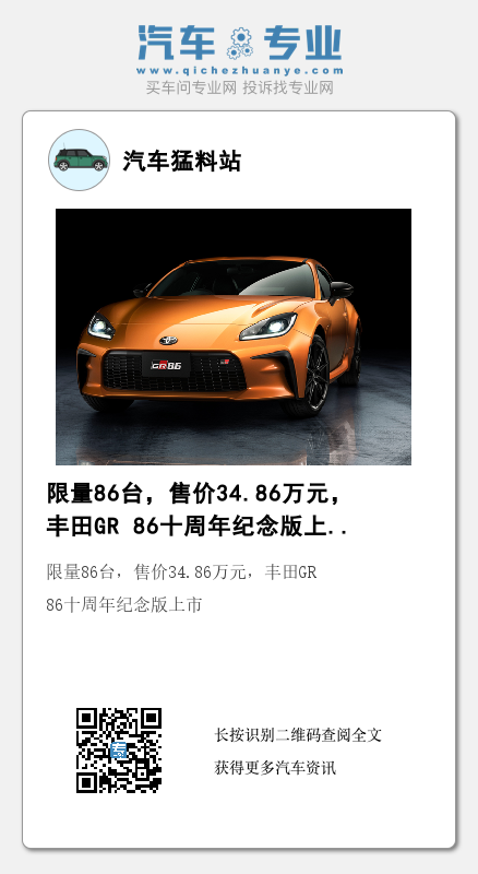12月25日,据丰田官方消息,丰田GR 86十周年纪念版车型正式上市,新车售价34.86万元,并在国内限量销售86台。