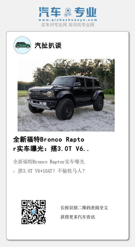 动力方面,全新福特Bronco Raptor搭载3.0T V6发动机,匹配的是10挡手自一体变速箱,从动力总成来看,表现的还是相当不错,有着强大的动力性能,还有着越野的风格。