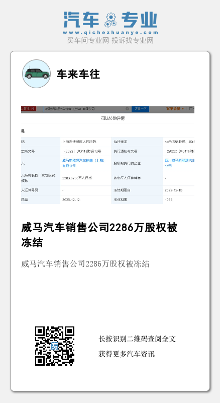天眼查App显示,近日,威马新能源汽车销售(上海)有限公司新增一则股权冻结信息,股权被执行企业为四川威马新能源汽车销售有限公司,股权数额2286.6735万人民币,冻结期限自2022年12月13日至2025年12月12日。