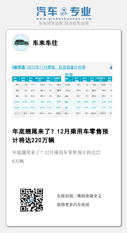 乘联会在相关分析中也指出,考虑到各地感染高峰的到来,消费者行为比较谨慎,聚集性活动和出行减少,年底翘尾效应可能受到抑制,第五周预计日均零售同比与去年持平。综合估算,12月狭义乘用车零售销量预计220万辆,同比增长4.5%,环比增长33.3%。