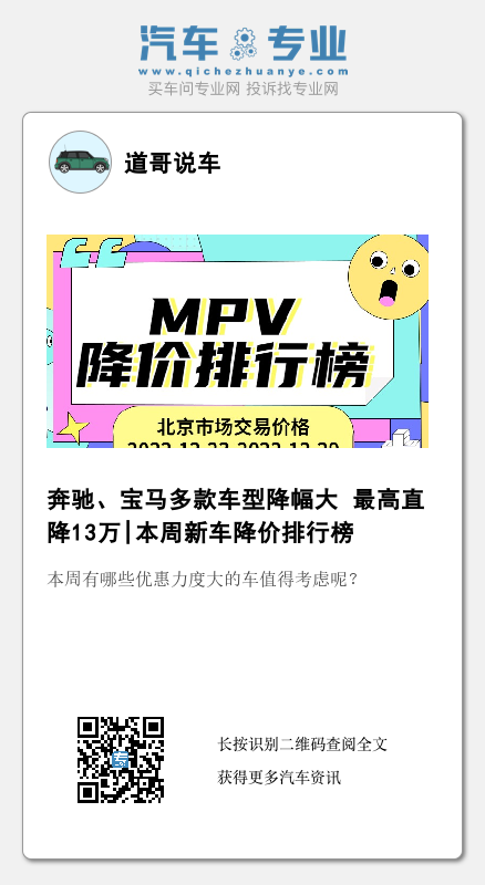 MPV方面,奔驰V级直降5万元的价格和月初降了8万元相比显得不那么划算,再说这款车本身的价格也很高,即便降了5万元,也是不痛不痒的。相反,和月初降价力度一样的别克GL6就显得比较“专一”了,本身这款车的价格就不高,又降了4.8万元,性价比上拿捏得死死的,对于想买MPV车型的消费者来说是个不错的选择。