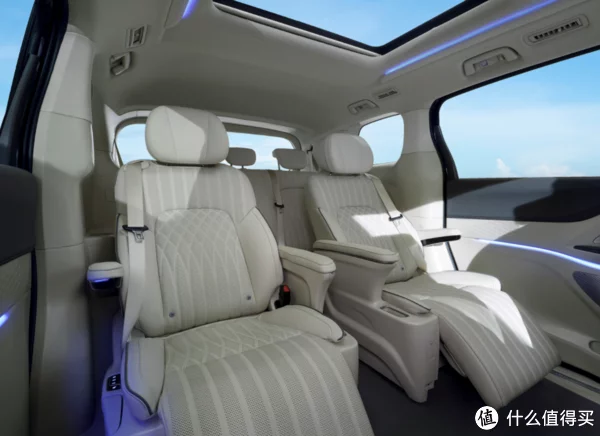 车内配备了10个金属质感的丹拿音响,64色可调的氛围灯,躺在柔软的按摩椅上,亮起氛围灯、打开音响,保准你路上疲劳一扫而光,车内配置完全对得起“保姆车”这个三个字。