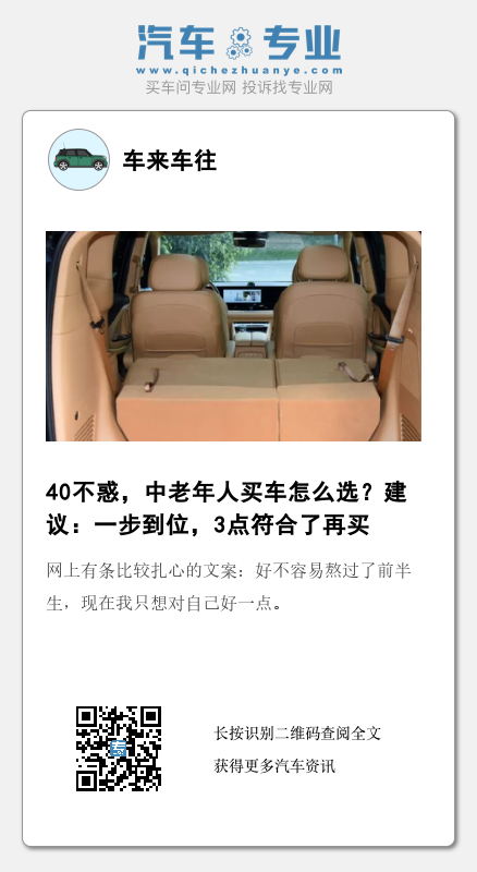 今天说说中老年人买车的事情,其实很多人在40岁左右,才会有自己的第一辆车,如果家庭条件还算可以,大概该购买第二辆代步车了,中老年人选车风格明显会更加成熟,撇去那些花里胡哨不实用的产品,更倾向耐用性,舒适性,当然也不能太低端,这个岁数了,不但要实用,面子也不能丢了。所以选车的时候,建议一步到位,可以优先考虑以下3点,别老是给家里省钱,对自己要好一些。