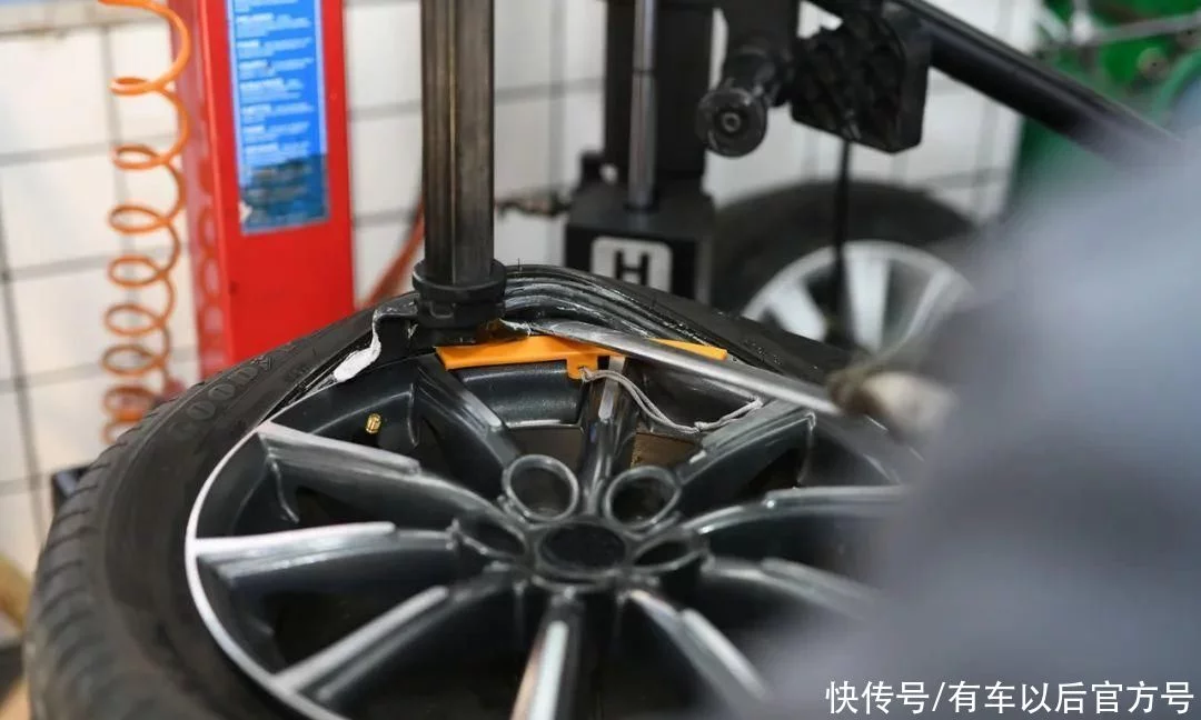 换新轮胎的第一道工序是要先把装有旧轮胎的车轮给拆下来,并用扒胎机把旧轮胎从轮辋上给扒下来。这其中比较考验操作流程的主要是如何扒胎能够不伤轮辋?这也是很多不负责任的汽修店做得不好的地方,换了轮胎,胎是新了,但轮辋伤痕累累。