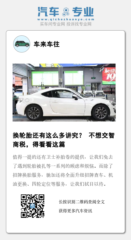 通过这次换胎服务,让我感受到驰加的专业和对细节的把控。我特别满意的地方在于驰加对于安全的重视。通过每一个专业工具,每一项环节精准的标准操作,确保换轮胎这件事上万无一失。另外,值得一提的还有卫士补胎卷的提供,让我们免去了遇到轮胎被扎等一系列的顾虑和烦恼。而除了招牌换胎服务,驰加还将全面升级招牌查车、机油更换、四轮定位等服务,让我们拭目以待。