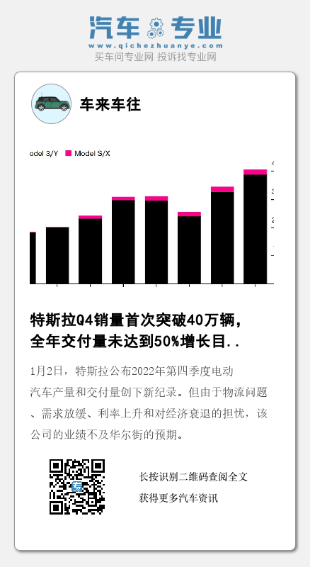 1月2日,特斯拉公布2022年第四季度电动汽车产量和交付量创下新纪录。但由于物流问题、需求放缓、利率上升和对经济衰退的担忧,该公司的业绩不及华尔街的预期。