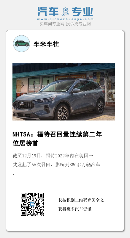 截至12月19日,福特2022年内在美国一共发起了65次召回,影响到860多万辆汽车。而2021年,福特发布了53次召回,涉及近540万辆汽车。