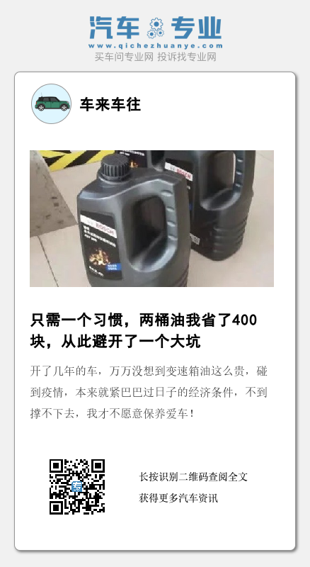 开了几年的车,万万没想到变速箱油这么贵,碰到疫情,本来就紧巴巴过日子的经济条件,不到撑不下去,我才不愿意保养爱车!